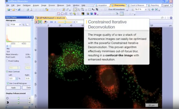 La soluzione Constrained Iterative Deconvolution integra i più recenti algoritmi per un miglioramento di risoluzione, contrasto e gamma dinamica con una velocità ineguagliabile nel settore attraverso l'elaborazione GPU. Algoritmi progettati specificatamente per un uso con l'FV3000 e la funzionalità per immagini Olympus Super Resolution (OSR) consentono di ottenere delle immagini più chiare e nitide dai sistemi all'avanguardia, utilizzando delle frequenze di quadro ultra-veloci e delle alte sensibilità.