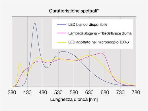 * Questo grafico mostra le caratteristiche spettrali di ogni fonte luminosa. Non è confrontata l'intensità luminosa per ogni fonte luminosa.