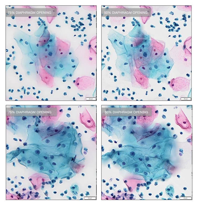以下の画像に示すヒトのパップテストサンプルは、ヘマトキシリン、オレンジG6、およびエオシンで染色されています。左側の画像は開口絞り75%、右側の画像は開口絞り50%で取得しました。 画像から、開口絞りを絞るとサンプルのコントラストが高くなる一方で、分解能はやや低くなる様子がわかります。