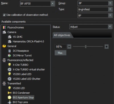 VS200システムでは、開口絞りの標準値として対物レンズのNAの75%を使用します。 対物レンズのNAが大きくなるほど、開口は広くなります。 開口絞りの設定を、例えば対物レンズのNAの50%にした観察法(OM)を新たに作成できます。