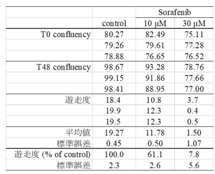 コントロールでは処理時間に比例してスクラッチ領域に細胞が遊走し、48時間処理の時点でスクラッチのほとんどの領域へ細胞が遊走しました。Sorafenib処理群ではSorafenib濃度に比例して細胞遊走が抑制され、48時間の段階ではスクラッチが埋まっていないことがわかります。