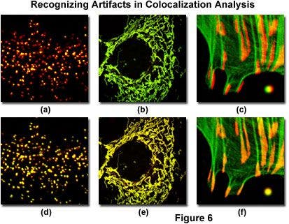 Illustrated in Figure 6 are several of the common artifacts discussed above, which often hamper accurate colocalization analysis in specimens labeled with multiple fluorophores (note that all fluorophore combinations in Figure 6 emit only green and red fluorescence). A human female osteosarcoma epithelial cell (U2OS line) transfected with enhanced yellow fluorescent protein fused to a peroxisomal targeting peptide sequence (green fluorescence), and subsequently immunofluorescently labeled with secondary antibodies conjugated to Alexa Fluor 568 (red fluorescence) targeting peroxisomal membrane protein (PMP-70) is presented in Figures 6(a) and 6(d). The black-level setting for image in Figure 6(a) was too high, resulting in reduced intensity for the yellow fluorescent protein label. This mistake skews colocalization analysis to produce an artificially low detectable level of overlapping pixels from the green channel. The properly leveled image is illustrated in Figure 6(d), which demonstrates a significantly higher degree of colocalization.