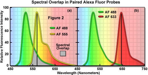The spectral overlap between Alexa Fluor probes decreases as the bandwidth between emission maxima increases, as illustrated in Figure 2(b). In this case, Alexa Fluor 488 and deep red fluorescent Alexa Fluor 633 demonstrate a significantly reduced level of overlap when compared to Figure 2(a). Both dyes are easily distinguishable to the human eye and the low degree of spectral overlap should yield good results with minimal bleed-through in colocalization experiments, provided the concentrations of each probe are similar (note that the deep red fluorescence of Alexa Fluor 633 may be difficult to visualize through the microscope eyepieces at low concentrations). Alexa Fluor 633 is most efficiently excited by the 633-nanometer line of a red helium-neon laser, but can also be used with the 594-nanometer line of a yellow helium-neon laser. Perhaps the best spectral separation in visible-light emitting Alexa Fluor dyes is the combination of Alexa Fluor 488 and Alexa Fluor 647 (not illustrated). There is virtually no spectral overlap between these dyes and bleed-through artifacts should be absent, even in specimens containing excessive levels Alexa Fluor 488. Fluorescent probes with these characteristics are ideal candidates for colocalization investigations on confocal microscopes equipped with the appropriate lasers.