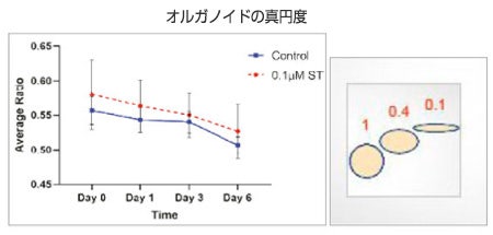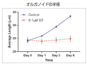 薬剤非添加のオルガノイドの培養では、オルガノイドのサイズに関連するパラメーター(面積、外周、半径)が経時的に増加しました。0.1 μMのST添加によって、細胞およびオルガノイドの死が誘発されました。ST添加のオルガノイドでは、オルガノイドの成長が完全に抑制され、オルガノイドのサイズの著しい増加は見られませんでした。