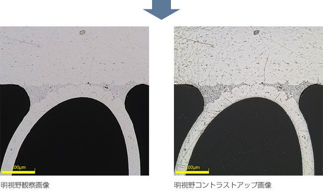 | 明視野画像より明視野コントラストアップ画像はロウ付けの状態がより鮮明に観察できます |