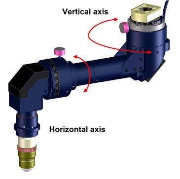 多光子顕微鏡法は、小さなマウスから霊長類などのより大きな哺乳類まで含む動物モデルにおける、脳構造および細胞レベルでの脳活動に関する生体内研究の主要ツールとなっています。同手法のアプリケーションの広がりに伴い、研究者は動的な脳の反応性研究のための、ますます高速な容積イメージング性能を求め続けています。従来の顕微鏡設計では困難な特定の脳領域観察への関心も高まっています。オリンパスのインナーフォーカス角度可変対物レンズ台は、これらの問題に対応しています。本装置はオリンパスのFVMPE-RS多光子顕微鏡に搭載でき、可動アームでより高い自由度を得ると同時に、機械的動作のない素早い軸方向の焦点合わせも容易に行えます。
