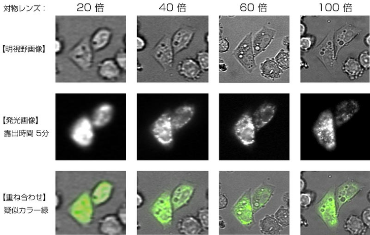 発光イメージングシステムLV200を用いて、ルシフェラーゼのペルオキシソーム局在を観察しました。また、20倍から100倍までの対物レンズを用いて、局在の解像度の違いや明るさの変化も同時に検証しました。