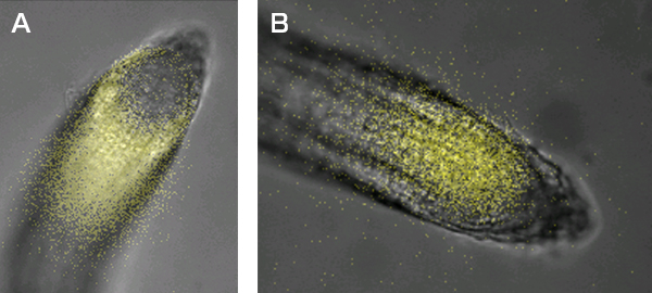 高等植物の分子遺伝学研究において用いられるシロイヌナズナの根は「透明で観察しやすい」、「細胞の種類が少ない」、「細胞系譜を容易に追跡できる」などの特徴を持つことから、植物の形態形成や刺激応答などの現象を細胞レベルで詳細に解析することができます。また、蛍光タンパク質や発光タンパク質を利用することで、根の細胞における分子レベルの活性を生きたまま観察することも可能です。