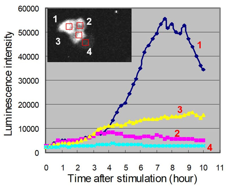 PMA刺激によりGFP標識PKCθが細胞膜に移行している様子が分かります。転写因子NF-κBに関して経時的に発光画像の取得を行った後、数値化を行った(図4※1、図5※1)。PMA刺激後、NF-κB遺伝子発現が次第に高くなり、8時間ほどで最も発現が高くなっている様子が分かります。(ルシフェリン濃度 100mM、対物レンズ: 40倍、binning: 1×1 、CCDカメラ: ImagEM(浜松ホトニクス(株))、露出時間: 10分、15分間隔で10時間撮影)。