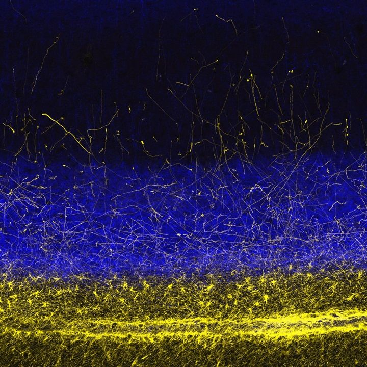 Au-dessus des étoiles / 星の上空:Axones exprimant le CB1R (en bleu) au-dessus des "étoiles" gliales exprimant la GFAP (en jaune) Cortex visuel du singe vervet, transition cortex/substance blanche.