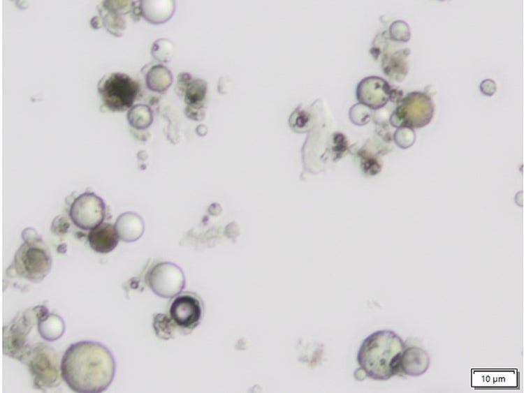 サンプルでは、褐炭を燃焼用にひき砕いてから燃焼室に吹き込みました。 多数の異なる灰の微粒子が作られる方法です。 燃焼室から排煙への流速は非常に速く、フライアッシュの微粒子は浮遊したままになります。 褐炭には鉱物も含まれていますが、燃焼プロセスで完全に融解します。 反応度の高いガラス相(画像内の透明な球体)は、こうして融解した液滴から形成されたものです。