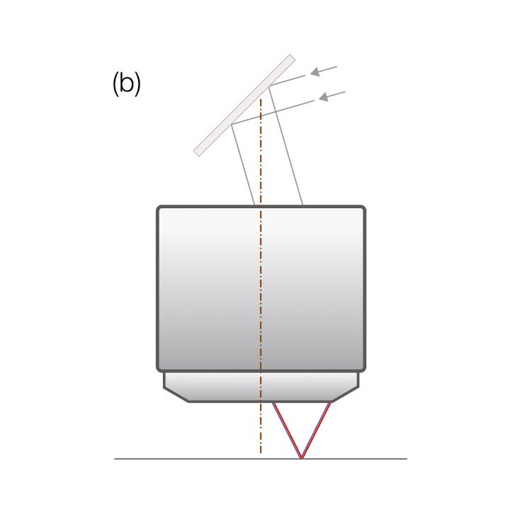 顕微鏡の結像光学系は、標本に近接して配置する「対物レンズ」と、対物レンズから射出された光を結像させる「結像レンズ」から構成されます。対物レンズと結像レンズの間には、光路分割のハーフミラーや蛍光観察のためのフィルター等を挿入するため、近年では対物レンズから射出する光は平行光(無限遠設計)とすることが一般的です。
