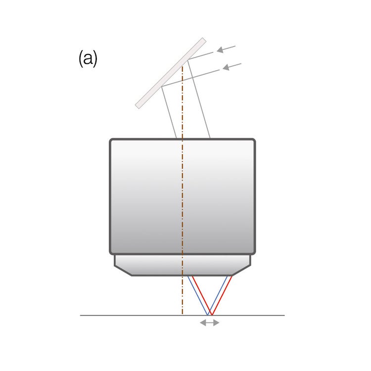 (a) コンペンゼーション方式では対物レンズの収差が残存しているため、レーザー光を意図しない箇所へ照射してしまうことになります。(b) コンペンゼーションフリー方式を採用している場合、レーザー波長による影響を受けません。