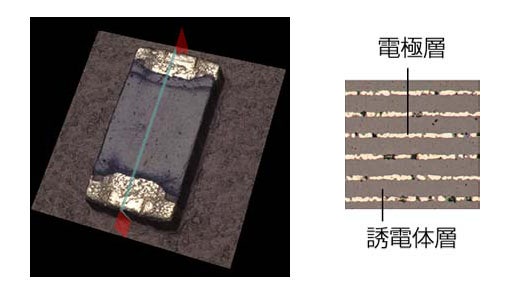 積層セラミックコンデンサは、セラミックスの誘電体と金属電極を多層化することで小型・大容量化を図ったチップ型コンデンサです。雑音を抑制する目的や回路定数を設定する目的など、ほとんどのエレクトロニクス機器に搭載されています。