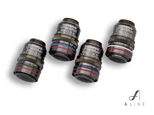 - オリンパスのX Line-高性能対物レンズは、400nm〜1000nmで色収差補正がされているため、コローカリゼーション解析で問題とされる色収差を低減します。さらに、より高いNA、優れた画像のフラットネス、UVからNIRまでの高い透過率を備え、多重蛍光イメージングで性能を発揮します。