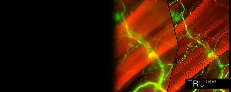 TruSightは、散乱光によるボケ部分に邪魔されて不鮮明だった画像を、ボケを除いたシャープなイメージとして画像処理します。イメージプレビュー中から画像取得時まで適用可能な2DオンラインデブラーやZスタック画像に適した3Dデコンボリューションオプションも用意しており、独自のアルゴリズムで高速に画像処理します。
