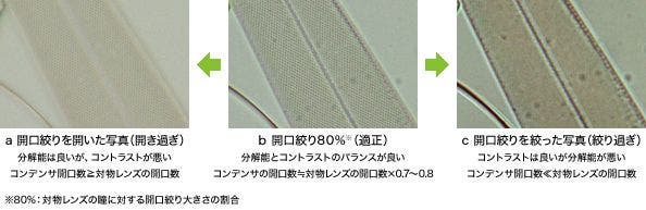 - コンデンサー開口数を対物レンズ開口数に対して50%以下に絞り込むと、分解能が悪化し像のエッジのくまどりが強くなり不自然な像になる。(図7c)