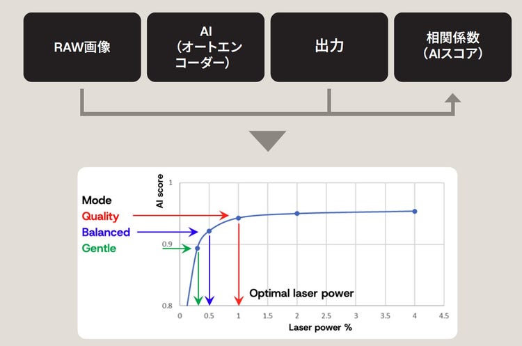 の向上を反映します。AIスコアが一定の値で安定する範囲が、適切なレーザー出力の目安となります。この範囲では、レーザー出力をさらに上げても画像品質の改