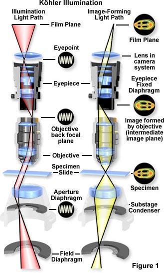 Likewise, the conjugate planes in the image-forming light path in Köhler illumination (Figure 1(b)) include: