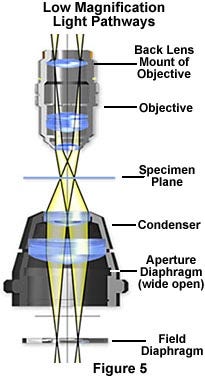The modified optical pathway for transmitted light in a low power microscope system is illustrated in Figure 5. The field diaphragm is now positioned in the correct plane to act as an aperture stop to control the numerical aperture and the size and shape of the light cone for the illuminating and image-forming light rays passing through the condenser. The specimen plane is fully illuminated with equiangular cones (as in Köhler illumination), however the filament is now imaged at back lens mount of the objective instead of the back focal plane.