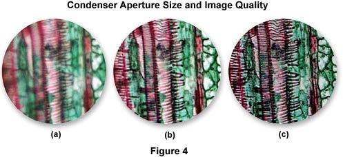 In Figure 4(a), where the aperture diaphragm is set to a position in which the numerical aperture of the condenser and objective are nearly equal, much of the fine specimen detail is visible, although there remains a considerable amount of scattering and glare. The image is also significantly brighter than its counterparts, which were made with a smaller setting of the aperture diaphragm. Figure 4(b) illustrates the Tilia stem at a condenser aperture size that produces a numerical aperture approximately 70 percent that of the objective. Glare is reduced, the image is very sharp, and fine image detail is present without significant diffraction artifacts. For this specimen, the photomicrograph in Figure 4(b) represents the optimum setting for the condenser aperture diaphragm. When the diaphragm is closed to the smallest setting at about 25 percent of the objective numerical aperture (Figure 4(c)), fine image details become obscured with diffraction artifacts and refraction phenomena. The image also takes on a darker overall cast that produces shifts in the color hues of the specimen. This concept can be explored in greater detail using the Interactive Java Tutorial on the substage condenser aperture diaphragm.