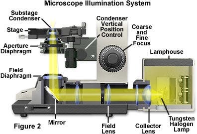 Figure 2 illustrates a typical microscope setup where the lamp housing (illumination source) is attached to the base and projects light through several lenses and then through the substage condenser after being reflected by a mirror in the microscope base. The light source itself should be precentered or centerable to the optical axis of the microscope. Light emitted from the tungsten-halogen lamp filament first passes through the collector lens located close to the lamp housing, and then through a second lens that is closer to the field diaphragm. Often, a sintered or frosted glass filter is placed between the lamp and the collector lens to diffuse the light and ensure an even intensity of illumination. In practice, the image of the lamp filament is focused onto the front focal plane of the condenser while the diffuser glass is temporarily removed from the light path. The focal length of the collector lens must be carefully matched to the lamp filament dimensions to ensure that a filament image of the appropriate size is projected into the condenser aperture. For proper Köhler illumination, the image of the filament should completely fill the condenser aperture.