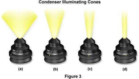 When properly adjusted, light from the condenser will fill the back focal plane of the objective with image-forming light by projecting a cone of light to illuminate the field of view (A thorough discussion of substage condensers is included in another section of the primer). The condenser aperture diaphragm is responsible for controlling the angle of the illuminating light cone and, consequently, the numerical aperture of the condenser. This concept is illustrated in Figure 3, where a series of condensers are illustrated with light cones (and numerical apertures) of decreasing size from left to right in the figure. Condenser light cone shapes are also a function of the degree of correction for optical aberration as demonstrated in the Interactive Java Tutorial below: