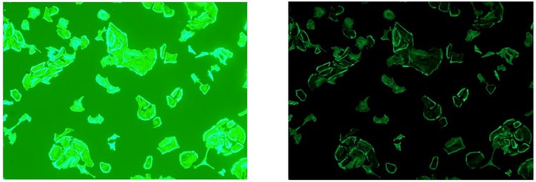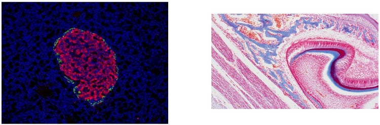 左:マウスの膵臓の蛍光観察、右:マウスの明視野観察画像