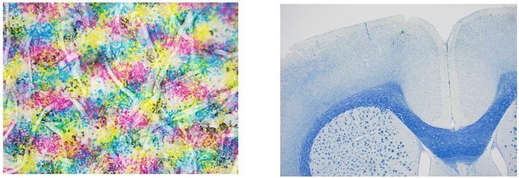 左:印刷物の色の混ざり具合を拡大観察した画像。色が画素レベルで分離されていることがわかる。