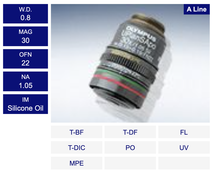 スーパーアポクロマート対物レンズは、可視から近赤外域までの球面収差、色収差を補正し、UVから近赤外域までの高い透過率を実現します。生体細胞の屈折率に近い浸液を使用するシリコーン浸、水浸対物レンズをラインナップし、ライブイメージングで効果を発揮します。