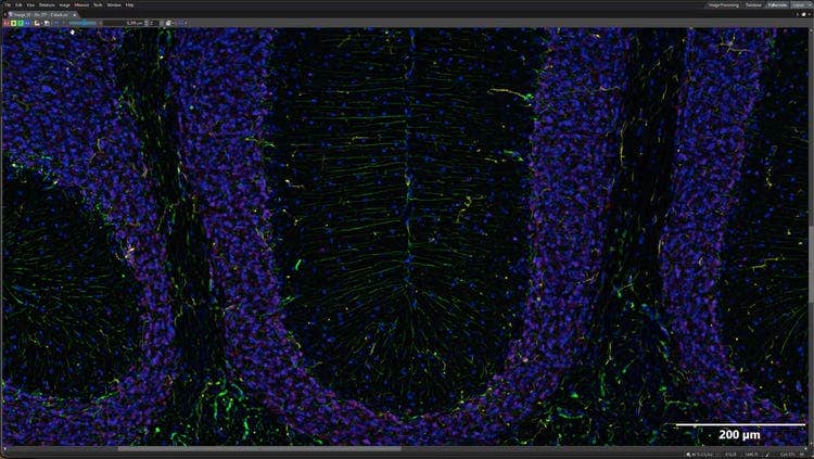 4Xで取得した概観、詳細スキャンは20Xで取得した19μm Zシリーズの拡大焦点画像(EFI)。青色: DAPI、緑色:GFAP(星状細胞)、黄色:IbaI(小膠細胞)。赤色: NeuN(神経細胞)。サンプル提供:Institute of Experimental Neuroregeneration, Spinal Cord Injury and Tissue Regeneration Center Salzburg (SCI-TReCS), Paracelsus Medical University, Austria.