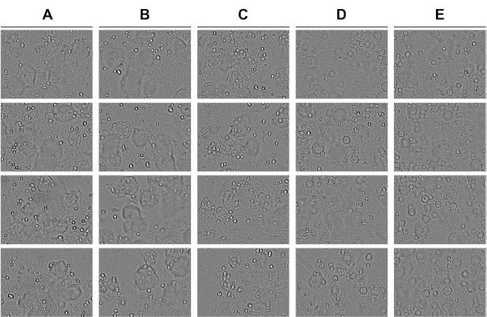인간 iPS 세포에서 유래된 간 오가노이드의 생성은 다양한 환경에서 잠재적인 가치를 보여주었습니다(Koido M et al., Nature Medicine 2020(PMID: 32895570), Takebe T et al., Nature 2013(PMID: 23823721)). 본 실험을 위해 3차원 배양 시스템에서 인간 iPS 세포로부터 간싹 오가노이드를 분화시켰습니다. 간싹 분화의 후기 단계를 바꾸기 위해 배지 성분이 변경된 5가지 다른 조건(여기서 A, B, C, D 및 E로 명명됨)을 테스트했습니다. 다른 화합물의 효과를 확증하고 최적의 배양 조건을 찾기 위해 오가노이드의 분화와 형태를 분석하였습니다. CM20 배양 모니터링 시스템을 활용하여 약 2주 동안 24개 웰 플레이트에 배치된 3D 배양 오가노이드에 대한 정보를 수집했습니다(그림 1).