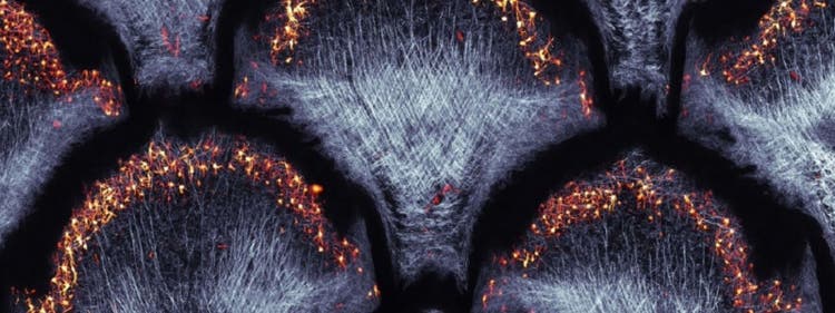 EMEA(유럽, 중동, 아프리카) 지역의 2020년 우승자는 스위스 제네바의 Grigorii Timin입니다. Grigorii는 아프리카산 뱀의 배아 비늘 진피층에 있는 콜라겐 섬유, 색소 세포, 적혈구 이미지를 출품했습니다. Grigorii는 “광학 절편은 비늘이 시작되는 깊이에서 피부 표면과 평행하게 되어 있기 때문에, 색소 세포를 포함하는 비늘 부분은 비늘의 끝이 아니라 오히려 비늘의 맨 아래”라고 설명합니다.