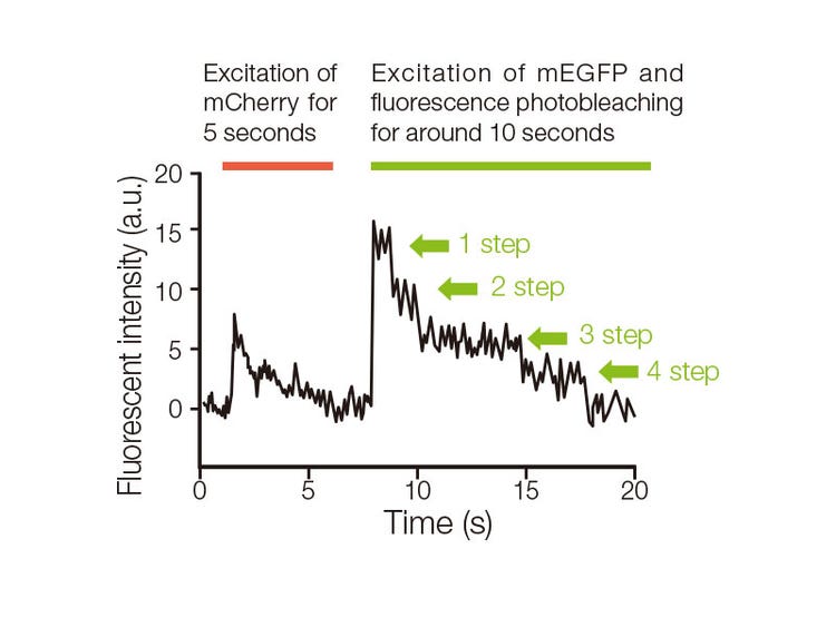 최초 5초 후 mCherry의 여기에 의해 Kv4.2–mCherry의 편재화가 시각화되고, 뒤이어 다음 10초 후 mEGFP의 여기에 의해 편재화 및 연속 형광 광퇴색이 시각화됩니다. 두 개의 형광 분자가 공동 국소화하는(흰색 화살촉으로 표시됨) 각 스폿의 형광 강도를 그래프로 나타내어 최대 4단계에 mEGFP의 광퇴색이 있는 스폿이 발견되었습니다. 따라서, mEGFP–DPP10의 최대 4개 분자가 Kv4.2 이온 채널 복합체에 결합되어 있는 것이 확인되었습니다.