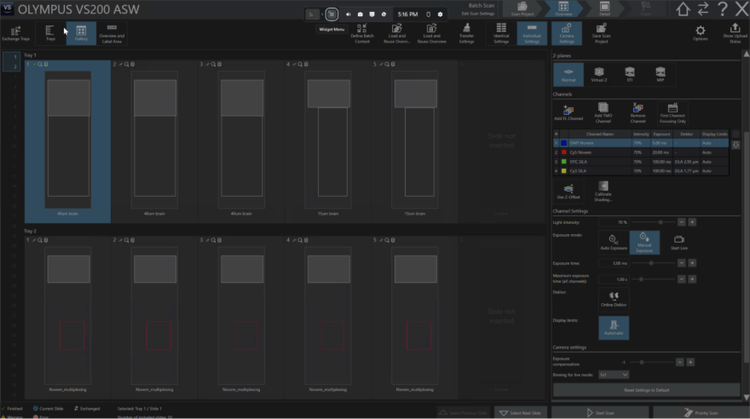파란색: X-Cite NOVEM LED를 사용하여 획득한 DAPI. 녹색: NFH(축삭). 노란색: Iba1(미세아교세포). 빨간색: VS-SILA 광학 절단 장치로 획득한 GFAP(성상세포).