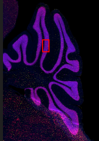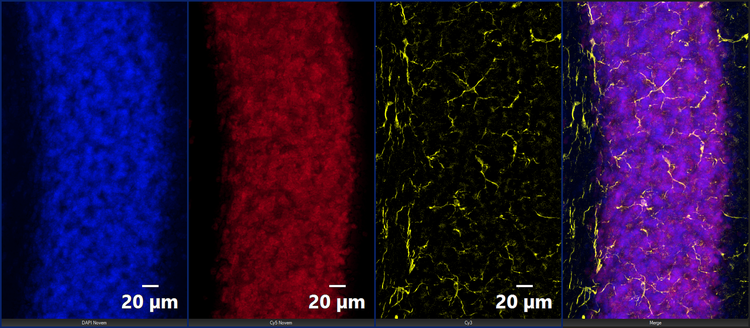 X-Cite NOVEM LED를 사용하여 획득한 파란색(DAPI) 및 빨간색(NeuN, 뉴런). 노란색: VS-SILA 광학 절단 장치를 사용하여 획득한 Iba1(미세아교세포).