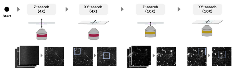 10X 대물렌즈로 전환한 후, 시스템은 순차적 검색을 수행하여 범위 내에서 최적의 Z 위치를 결정합니다. Z-검색 범위는 4X에서 확인된 최적의 Z-위치와 4X 렌즈의 Z-해상도를 기준으로 결정됩니다.