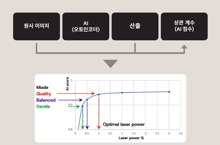- 각 이미지에 대해 시스템은 AI 점수를 계산합니다. 이미지 품질의 지표(그림 7의 1~3단계). AI 점수가 표시되고, 그래프와 선택된 모드를 기반으로 시스템은 최적의 레이저 출력을 추정합니다(그림 7의 단계 4).