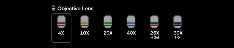 그림 2. 대물렌즈 선택 화면. 사용자는 원하는 대물렌즈를 직관적으로 선택할 수 있으며, 현재 활성화된 렌즈를 쉽게 식별할 수 있습니다.