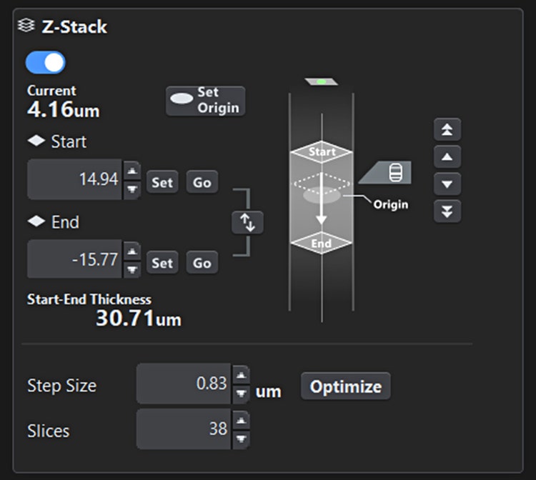 그림 1. Z-범위 설정 화면. 이미징의 시작 및 종료 위치와 현재 관찰 위치가 한눈에 명확하게