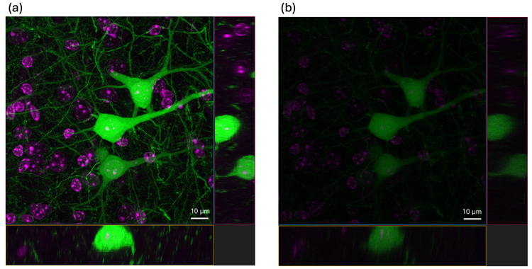 0.85 µm 간격으로 LUPLAPO25XO(NA 1.0, WD 1 mm) 대물렌즈를 사용하여 27장의 Z-스택 이미지를 획득했습니다. 표시된 이미지는 XY 평면의 최대 강도 투영(MIP)과 XZ 및 YZ 평면의 단면 뷰를 포함합니다. 마젠타: DAPI로 염색된 핵. 녹색: GFP로 표지된 뉴런.