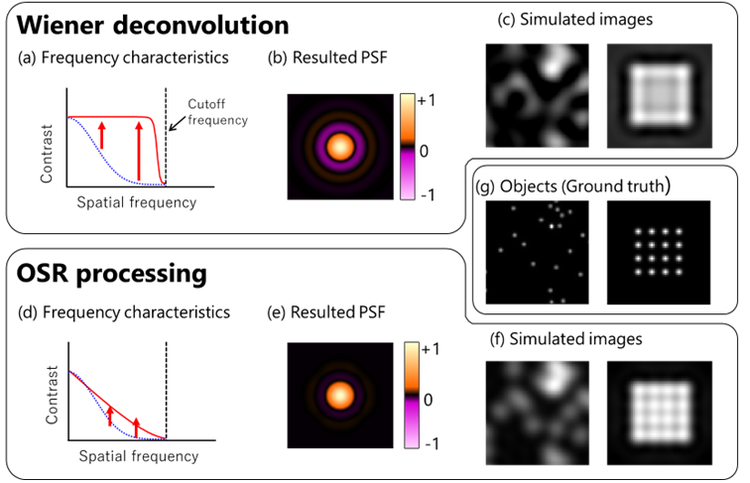 OSR 처리의 특징 중 하나는 결과의 신뢰성이 높다는 것입니다. OSR을 위너(Wiener) 디콘볼루션과 같은 다른 일반적인 처리 방법과 비교해 보면 이러한 특징을 알 수 있습니다. 현미경으로 관찰한 이미지는 개체 분포 콘볼루션과 점 확산 함수(PSF)로 표현할 수 있습니다. 주파수 영역에서, 이는 PSF의 푸리에 변환에 의한 개체 구조의 주파수 특성의 감쇠에 해당합니다(광학 전달 함수(OTF)). 위너(Wiener) 디콘볼루션은 OTF의 역수를 관찰된 이미지의 주파수 특성으로 곱하여 콘볼루션을 해결하므로 원래 개체 분포가 복원됩니다.