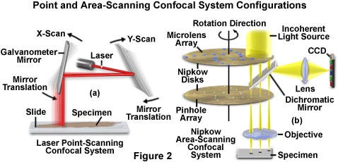 공초점 이미징은 공간적으로 필터링된 개별 시편 지점에서 순차적으로 빛을 모은 다음 전자 신호를 처리하고 궁극적으로 해당 이미지 지점으로 시각적 표시를 행합니다.점별 신호 수집 프로세스에는 관찰 중인 시편 볼륨을 통해 초점을 맞춘 조명 빔을 스캔하는 메커니즘이 필요합니다.공초점 현미경 이미지를 생성하기 위해 일반적으로 세 가지 주요 스캐닝 변형 방법이 사용됩니다.근본적으로 공초점에 해당하는 작동 방식은 스캐닝 디스크라고도 하는 회전식 Nipkow 디스크 의 구경을 통해 전송되는 일련의 광점으로 시편을 스캔하는 한편, 고정 스테이지가 있는 스캔 광선 빔(빔 스캐닝)인 고정 조명 광선(스테이지 스캐닝)에 결합된 측면 이동 시편 스테이지를 사용하거나 스테이지와 광원을 모두 고정식으로 유지하여 달성할 수 있습니다(그림 1 및 2 참조).각 기술에는 특정 공초점 응용 분야에는 유리하지만 다른 응용 분야에서는 유용성이 제한되는 성능 기능이 있습니다.
