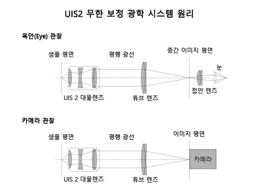 무한보정 광학계는 대물렌즈와 튜브렌즈 사이의 병렬선 사이의 중간 단계 구성 요소를 쉽게 추가하거나 삭제할 수 있도록 도와줍니다. 사용자는 광학 성능에 영향을 끼치지 않으면서 자유롭게 프리즘과 슬라이드를 더할 수 있습니다. 이는 한정 광학 시스템은 제공할 수 없는 이점입니다. 모든 Olympus 대물렌즈는 45mm의 동초점 길이에 표준 스레드를 겸비하며 튜브렌즈의 초점 길이는 단 180mm이므로 사용자 정의 어셈블리에 콤팩트하게 통합할 수 있습니다.