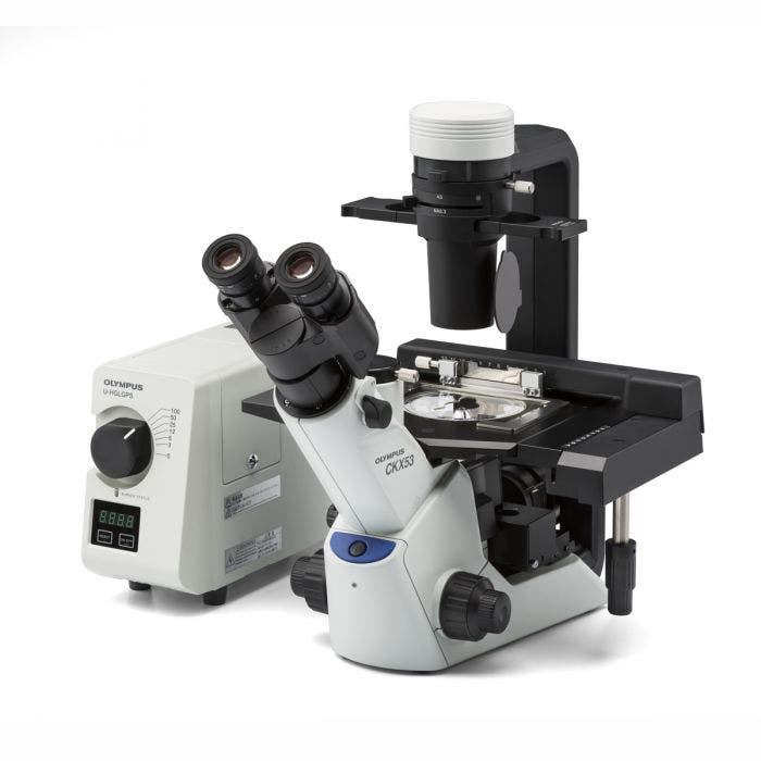 Tissue Culture Inverted Microscope. Complete CKX53 kit for bright field, phase contrast, and fluorescence observation. Includes trinocular head for camera compatibility, 4x, 10x, 20x, and 40x objectives for phase contrast, fluorescence illuminator with long-pass filter cubes, LED condenser, phase contrast slider with inserts, dust cover, and power cable.*Camera, camera adapter, fluorescence light source not included.