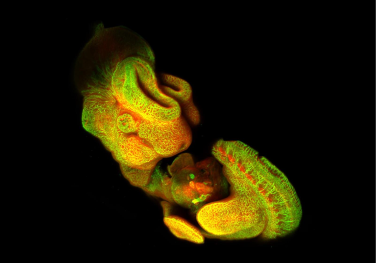에틸 신나메이트로 투명화 처리한 전체 마우스 배아에 Alexa Fluor 405, 488, 568을 표지했습니다.