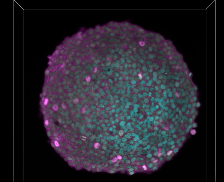 DAPI(시안, 세포핵)와 AlexaFluor790(마젠타, Ki-67)로 염색된 HeLa 세포 구형체