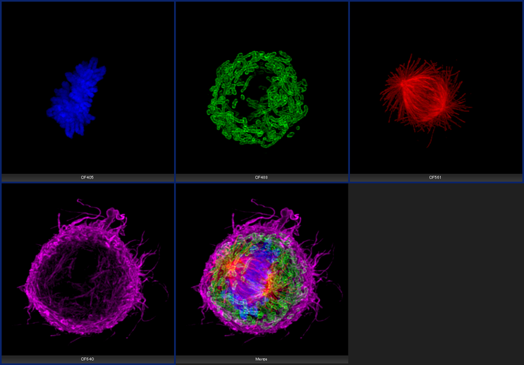 파란색: 핵, 녹색: 미토콘드리아, 빨간색: 튜불린, 자홍색: 액틴