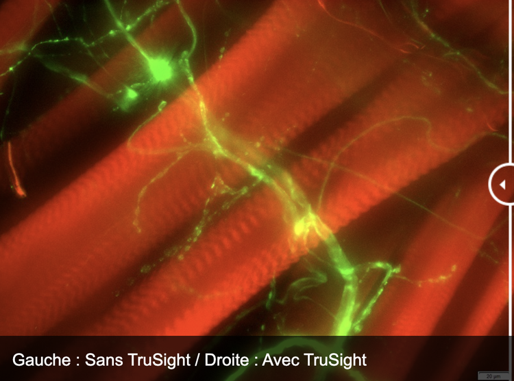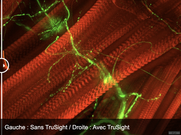 cellSens Dimension 소프트웨어를 사용하면 미리 보기 및 획득을 위한 라이브 2D 디블러링을 통해 두꺼운 표본에 초점을 매우 효과적으로 맞출 수 있습니다. 반복 알고리즘을 사용하여 향상된 해상도, 대비, 다이내믹 레인지를 생성하는 더 발전된 TruSight 디콘볼루션도 사용할 수 있습니다. 실험 효율성을 더 높이기 위해 GEM(Graphical Experimental Manager)에서 디콘볼루션 처리를 매크로 기능으로 정의할 수 있습니다.