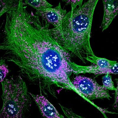 *이미지: NIH 3T3 세포(파란색: 핵, 녹색: 튜불린, 자홍색: 미토콘드리아, 회색: 피브릴라린)